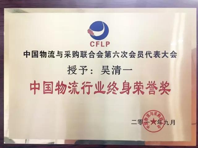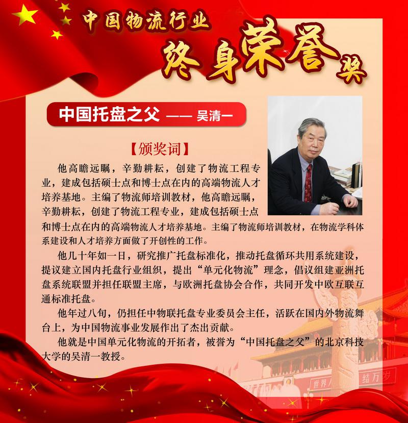 吳清一教授幾十年來(lái)為中國(guó)物流事業(yè)發(fā)展做出重大貢獻(xiàn),尤其在托盤(pán)物流領(lǐng)域取得了矚目的成就,經(jīng)中國(guó)物流與采購(gòu)聯(lián)合會(huì)研究決定,授予吳清一教授“中國(guó)物流行業(yè)終身榮譽(yù)獎(jiǎng)”。