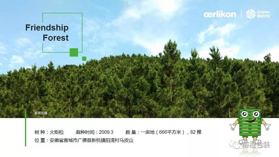 歐瑞康(Wuxi)與前程公司的友誼林位于安徽省廣德市前程?hào)|盛生態(tài)林業(yè)有限公司的林場(chǎng)內(nèi),林場(chǎng)現(xiàn)有土地總面積3000多畝,林場(chǎng)內(nèi)有松樹(shù)林、竹林、水庫(kù)、茶園、山核桃園等;友誼林占地面積為一畝地(666平方米),82棵松樹(shù),品種為火炬松,寓意著雙方的合作擁有更加美好的明天。